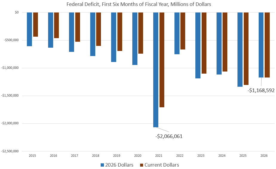 Looking at the first six months of the current fiscal year combined—a period which began on October 1, 2025—federal spending was up by $83.9 billion, or 2.3 percent. At $3.6 trillion for the fiscal year so far, that’s the highest level of spending ever, and is now even higher than spending during the days of juiced-up COVID-panic outlays. Even when adjusted for inflation, 2026’s spending for the first six months of this fiscal year is at the highest level for every year except for 2021. In other words, the only other year with higher spending was the year when Trump ratcheted up spending toward the end of the 2020 calendar year, which was an election year. Trump continued to push historically high spending levels for the first four months of the 2021 fiscal year, until he finally left office at the end of January 2021.