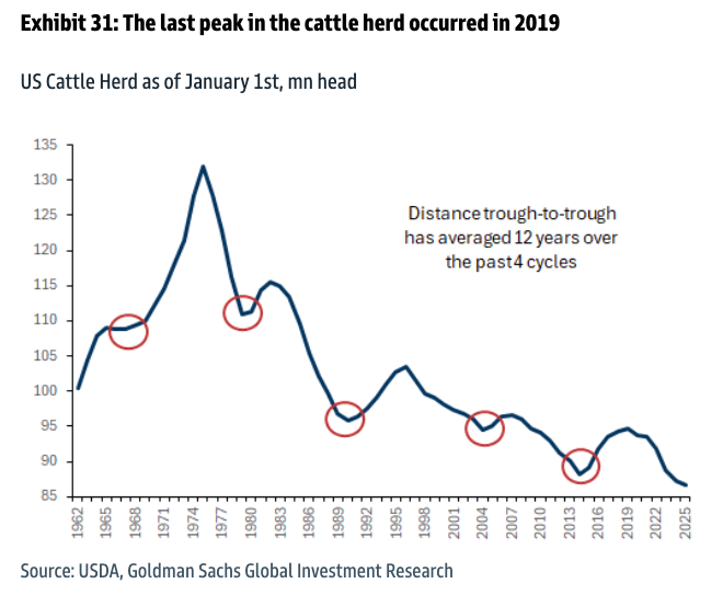 Last month, Goldman analysts Leah Jordan and Eli Thompson signaled that the 12-year cattle herd cycle has likely reached a cyclical low, suggesting a rebuilding phase may be approaching. However, any eventual recovery is unlikely to be a sharp “V” and will more likely take the shape of a prolonged “U”.