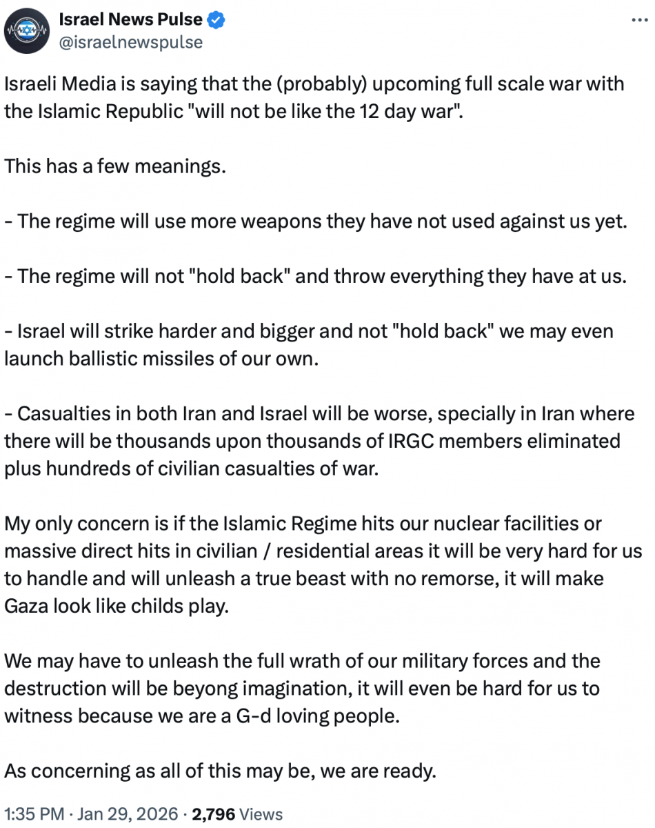 “A limited [U.S.] strike is an illusion. Any military action by America, of any kind and at any level, will be considered the start of a war, and the response will be immediate, comprehensive, and unprecedented, directed at the aggressor, at the heart of Tel Aviv, and at all who support the aggressor.”