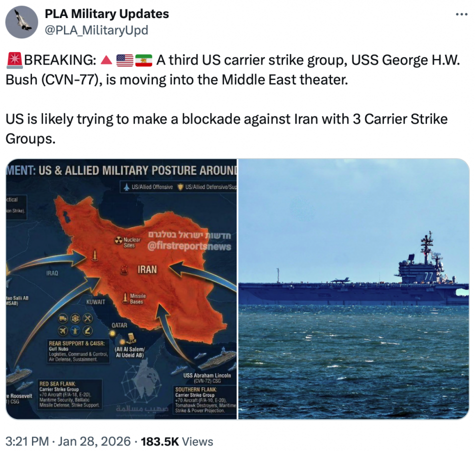 In addition to having the USS Abraham Lincoln positioned south of Iran, the USS Theodore Roosevelt is currently in the Red Sea, and the USS George H.W. Bush is now traveling toward the Middle East…