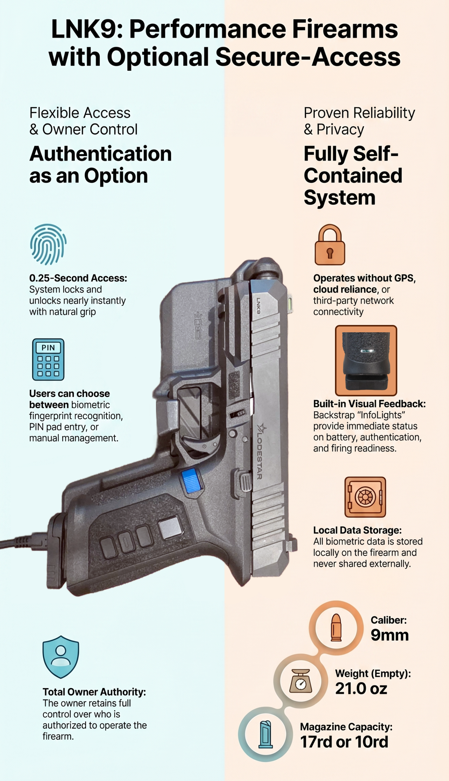 The Lodestar LNK9 represents a significant strategic leap forward. By embedding safety innovation into a proven, veteran-designed platform, Lodestar has managed to avoid the pitfalls that have plagued “smart” guns for decades. At an MSRP of $979.99, it is priced as a premium duty pistol, but it offers a suite of features—user authorization, local data management, and specialized ergonomics—that its competitors simply do not provide.