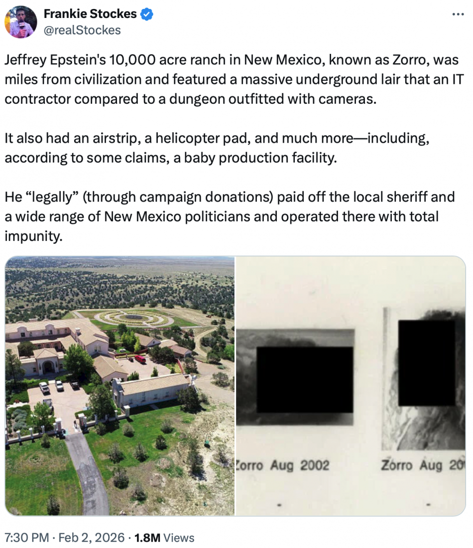 While Little Saint James Island, infamously known as Pedophile, Rape, and Epstein Island, has received the bulk of attention in the fallout from the cover-up of Epstein’s crimes, his Zorro Ranch property is another centerpiece of the crimes committed by his criminal network. Located in the high desert north of the Estancia Basin of central New Mexico, where Epstein was not required to register as a sex offender following his 2008 plea deal in Florida, the sprawling 7,600-acre ranch hosted numerous parties implicated in Epstein’s crimes. Epstein reportedly organized the ranch as the headquarters for his eugenic plot to “seed the human race with his DNA” by impregnating countless women and underaged victims on the property. Victim Annie Farmer, alleges that Epstein and his prime accomplice, Ghislaine Maxwell, sexually abused her at the ranch when she was just 16-years-old.