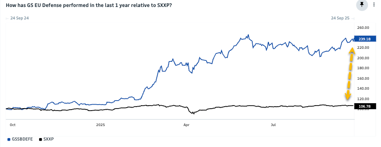 The GS EU Defense basket has widely outpaced the STOXX Europe 600 so far this year.