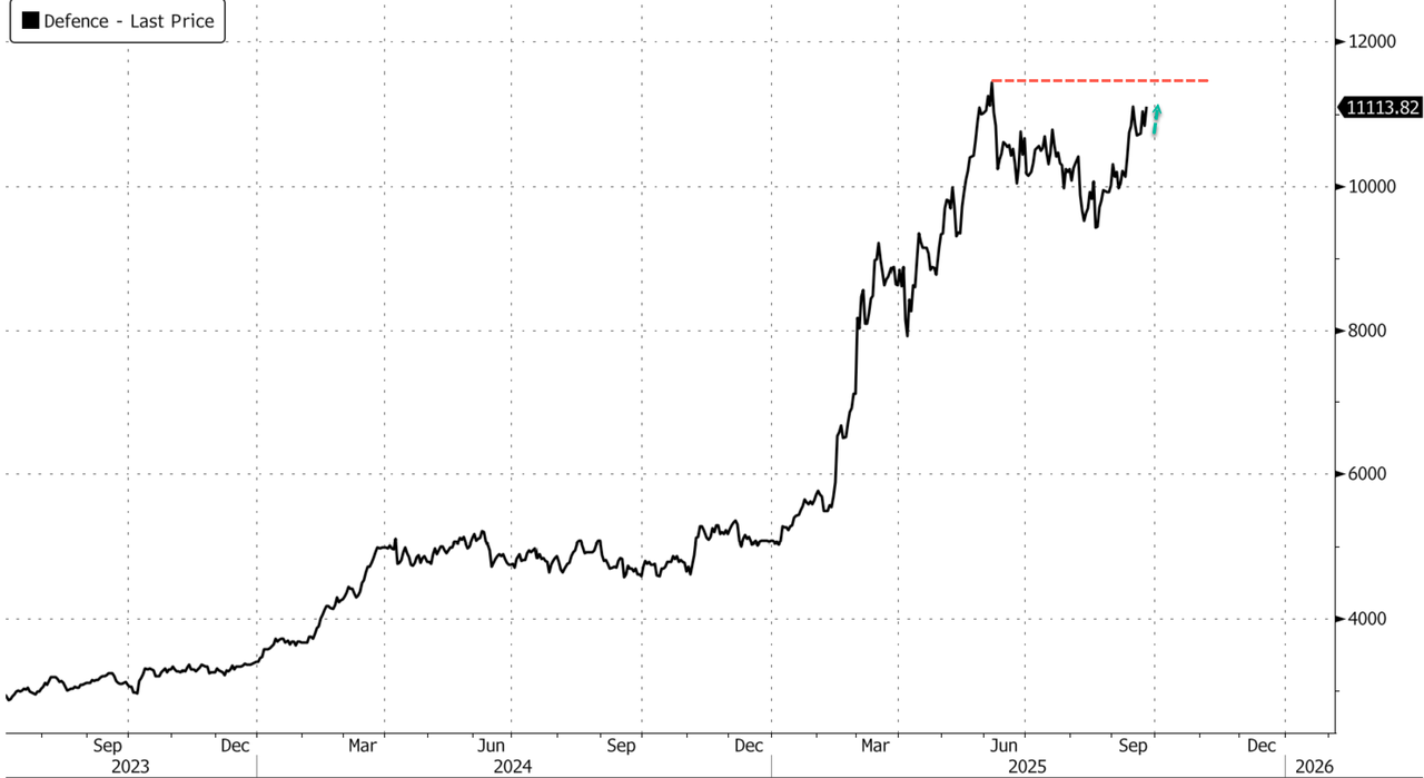 The GS European Defense basket is up 2.7% in early afternoon trading. Industry heavyweight Rheinmetall AG gained 2%, while the UK’s BAE Systems Plc rose 1%. Sweden’s Saab AB jumped 5% to a record high. After trading sideways for four months, the defense index appears to have been energized by Trump’s latest comments, sparking renewed optimism among defense bulls.